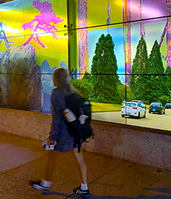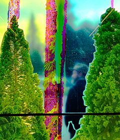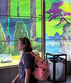 Stained glass windows for the King Edward Transit Station, Canada Line, the work features Vancouver landmarks: the Two Sisters (mountain peaks), sequoia trees on the Cambie Boulevard, a twisted pine from Lighthouse Park, a lichen covered rock.
